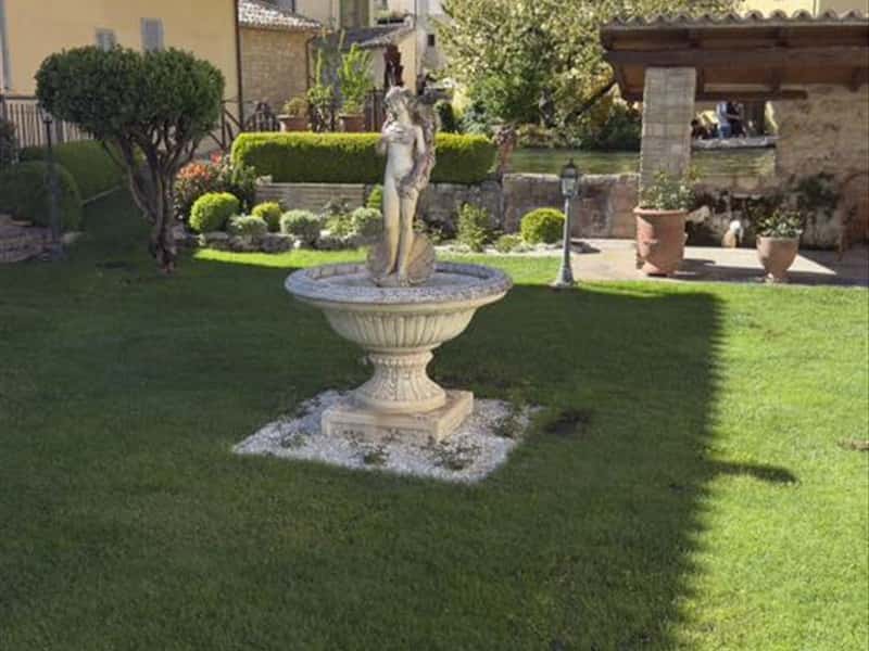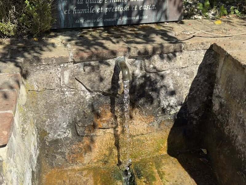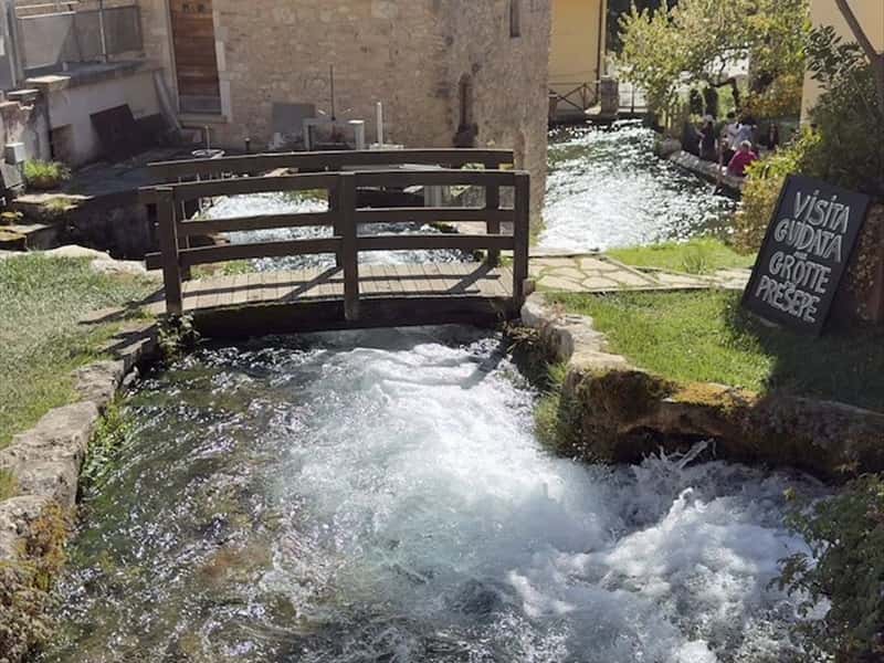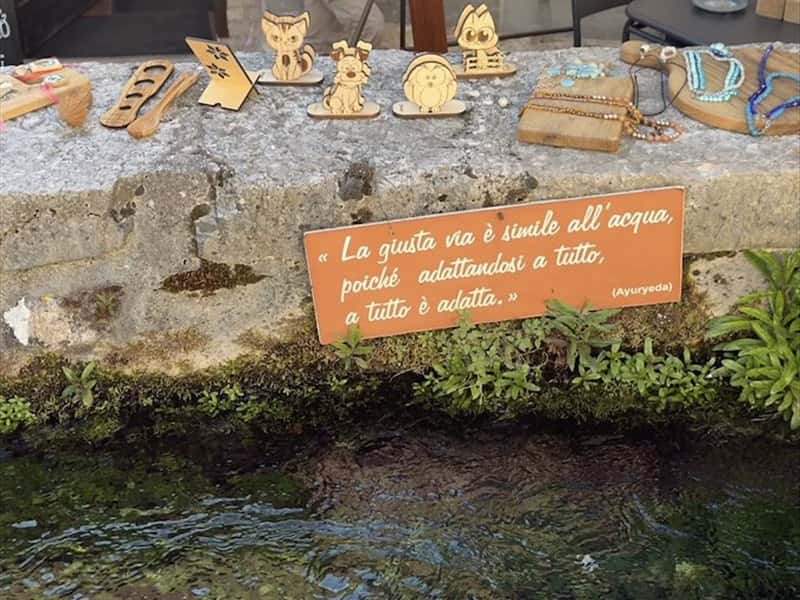 Il percorso che attraversa il borgo è un continuo alternarsi di scorci da cartolina: canali cristallini che scintillano al sole di primavera, piccole cascate che sbucano tra la vegetazione rigogliosa, ponticelli in legno che scavalcano correnti impetuose, giardini curati con fontane e sculture in corten che dialogano con la pietra antica. Ogni angolo racconta qualcosa, ogni pietra ha una voce. E sulle pareti del borgo, citazioni sull'acqua — da Francesco d'Assisi all'Ayurveda — ricordano ai visitatori che qui l'elemento primordiale è filosofia oltre che natura.